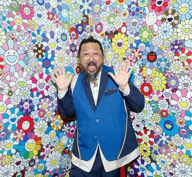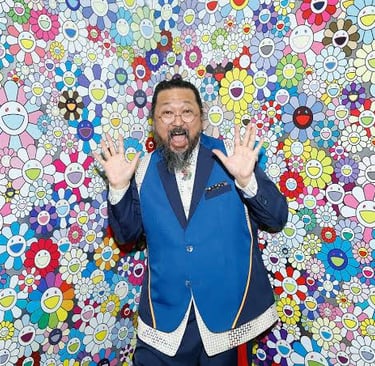 Artiste japonais célèbre pour son style "Superflat" qui fusionne art traditionnel japonais, culture pop et esthétique manga. Il explore des thèmes comme la société de consommation, l’iconographie kawaii et la relation entre l’art et le commerce. Murakami est aussi connu pour ses collaborations avec des marques comme Louis Vuitton et des artistes comme Kanye West.